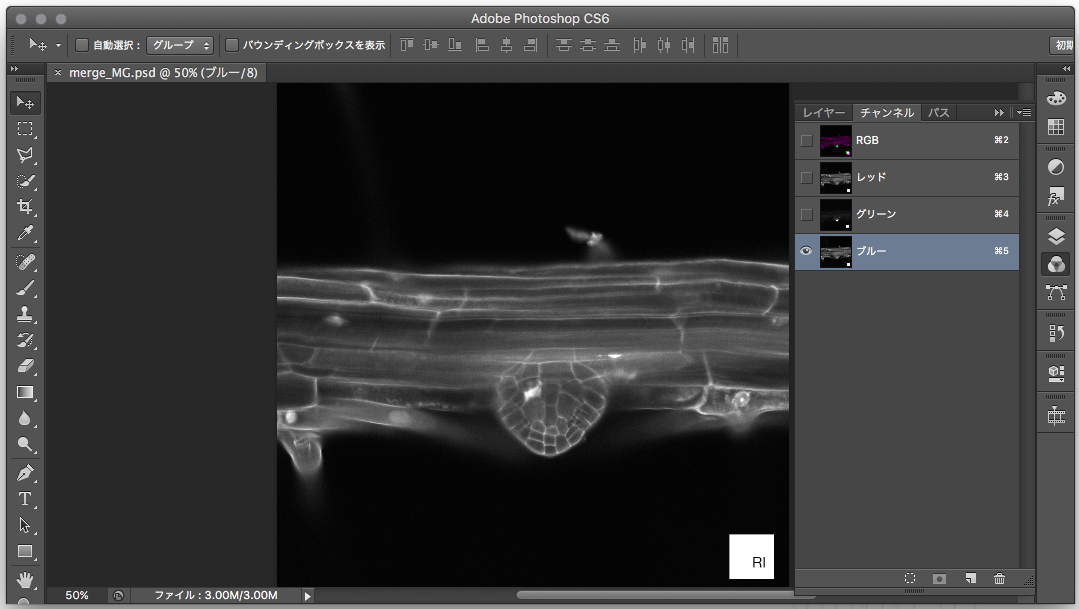 通常、赤蛍光の画像は赤チャンネルへ、緑蛍光の画像は緑チャンネルへ貼り付けて色をつけますが、赤蛍光をマゼンタで表示するには、赤蛍光画像を赤チャンネルだけでなく青チャンネルにも貼り付ければよいだけです。とても簡単です。Adobe Photoshopを使用した詳しい方法はこちらの動画 を参考にしてください。