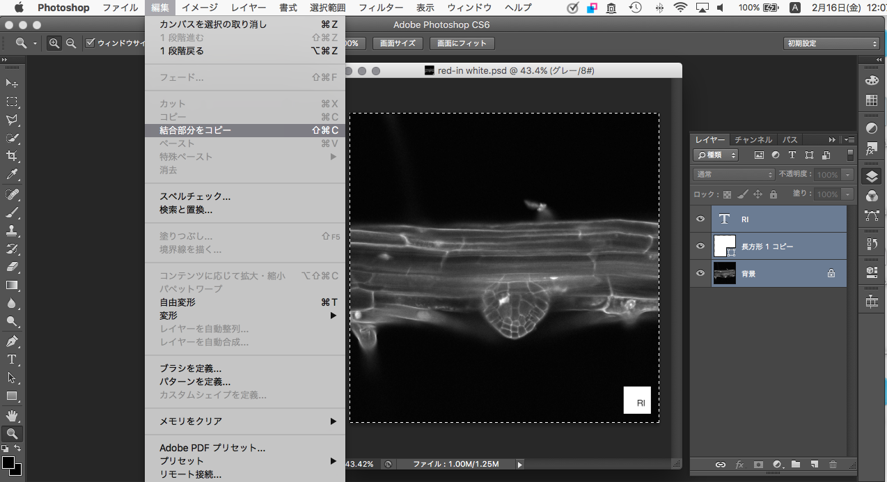 マゼンタと緑にしたからといって、2色を区別できても、色覚によって見えている色は異なります。画像の中に凡例を入れるとよいでしょう。各蛍光の画像にレイヤーを作成し、白い正方形の中に黒字で使用した蛍光試薬などの名前を書き込みます。背景の画像も含めて全て選択したのち、各チャンネルにコピー&ペーストで貼り付けてしまいましょう!!(ただし、凡例の図形の一部をちょうどよく重ね合わせるために、いちいち元画像のレイヤーの図形を動かして、貼り付け直さないといけないのがちょっと面倒です。)